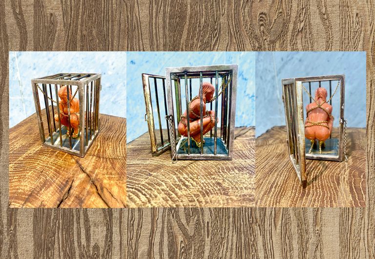 zurückgezogen hat. Grimmig schaut er drein, oder nur versonnen, den Blick auf die goldene Kugel gerichtet. Bewacht er diese, oder meditiert er nur? Sind seine Augen gerötet vom langen Starren, oder hat er einfach nur schlecht geschlafen auf dem harten Amazonit? Ein Objekt. Viele Interpretationen. Doch wozu eine Erklärung? Lassen wir Hubert sich auf seine kleine Scholle zurückziehen und bewundern die filigrane Arbeit.