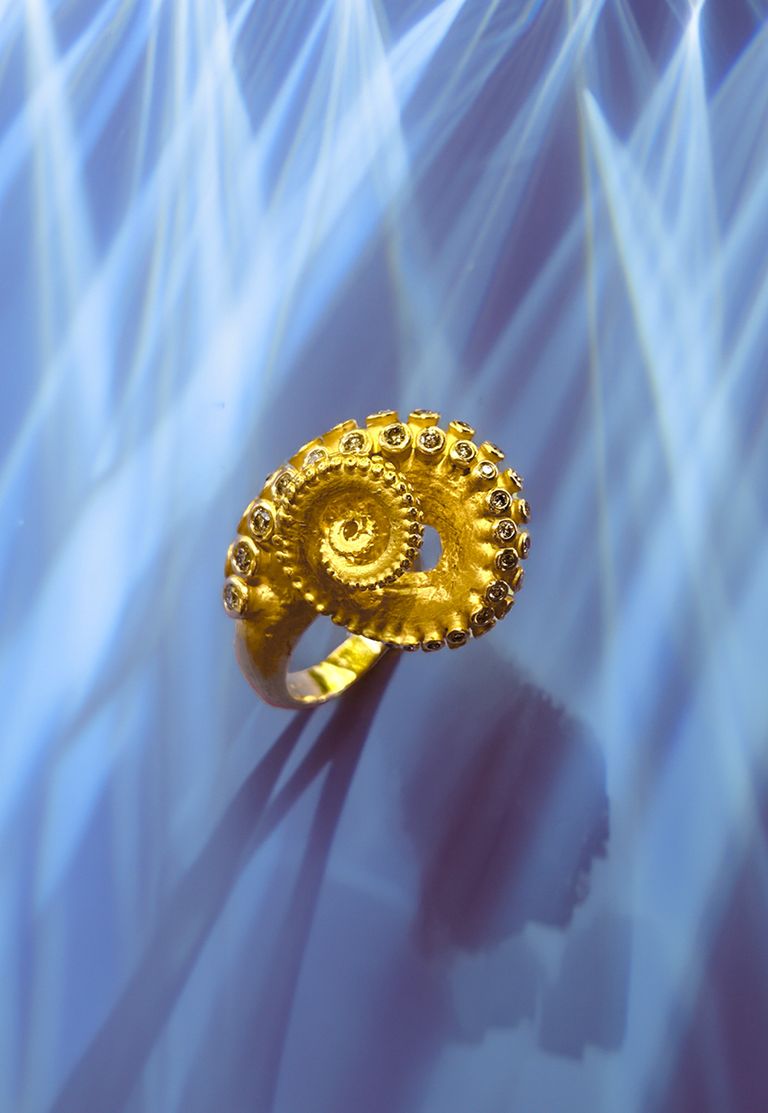 Was blieb von der letzten Documenta in Kassel? Die Mohnkapseln vom Mohnfeld, nun in Feingold gegossen und zur filigranen Kaskade eines Halsschmucks vereinigt. „Das überlebt die Documenta“, sagt Günter Krauss. Er sieht das Edle in alltäglichen Dingen, dazu ist ihm die Natur ein unerschöpflicher Quell an Inspiration und Fundus von Formen und Strukturen. Nicht nur Steine, Blätter, Muscheln oder Schnecken. Auch mal eine Bandscheibe vom Walfisch. Die Scheren von Kaisergranaten. Das Gehörn einer Heidschnucke. Oder das verwitterte Stück einer Agave. Eine Chilischote, wie sie ein Gourmet und Autor von Kochbüchern in Gold besitzt, um daraus stets und überall seinem Essen die nötige Prise Schärfe zu geben. Seine Frau und Mit-Autorin trägt eine kleine Muskatreibe als Anhänger. Und nutzt sie auch entsprechend. Wertfrei denken Er weiß, dass diese Gabe des besonderen Blicks ein Geschenk der Götter ist: „Ich greife in eine Kiste, hole ein Teil heraus und weiß, was daraus wird.“ Werte dürfen dann keine Rolle spielen: „Ich will wertfrei denken. Egal, ob Lederband oder Koralle, Eisen oder Platin, Kiesel oder Smaragd, alles hat für mich beim Entwerfen erst mal den gleichen Stellenwert.“. Nicht Diamant, Rubin, Smaragd oder Saphir, reines Mineral und ranghöchste Edelsteine, sind seine Lieblingssteine, es ist der Achat, geologisch als amorphe Kieselsäure klassifiziert und früher als Halbedelstein abgetan: „Sein Reichtum an Formen und Einschlüssen überrascht und fasziniert mich immer wieder.“ Genau wie der Turmalin, dem er oft den Vorzug gibt, weil er in allen Farben des Regenbogens vorkommt. Und nicht nur er: „Meine Kunden sind bereit, für einen ausgefallenen Turmalin mehr zu bezahlen, als für einen Brillanten.“ Design, das zum Stil erzieht.